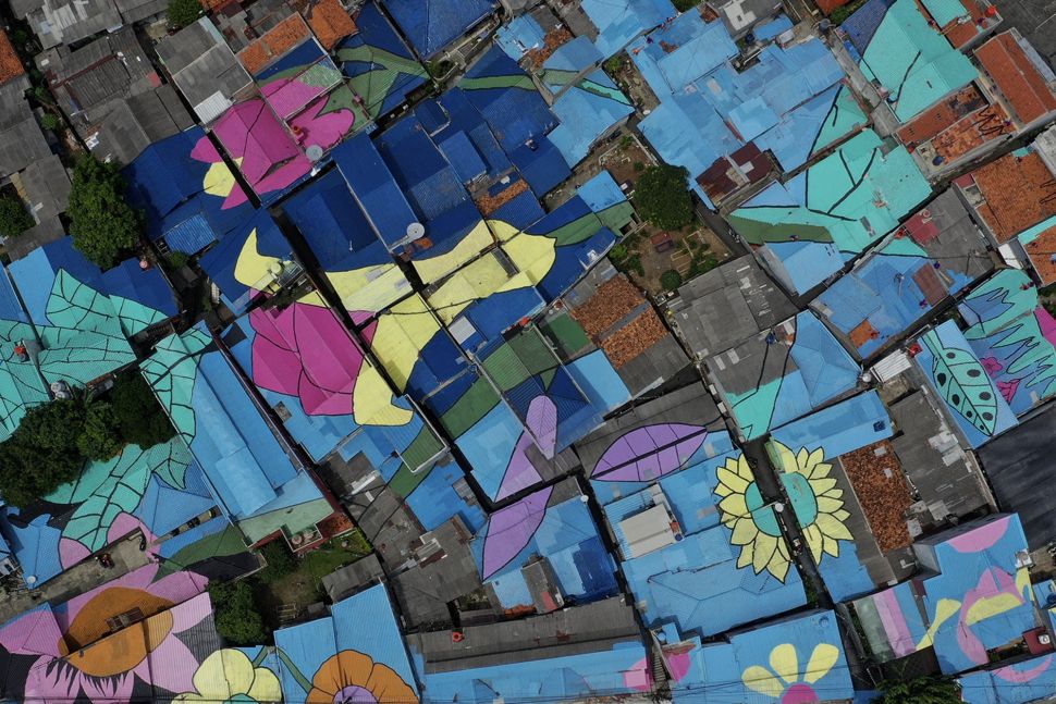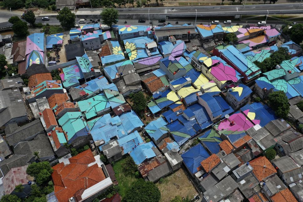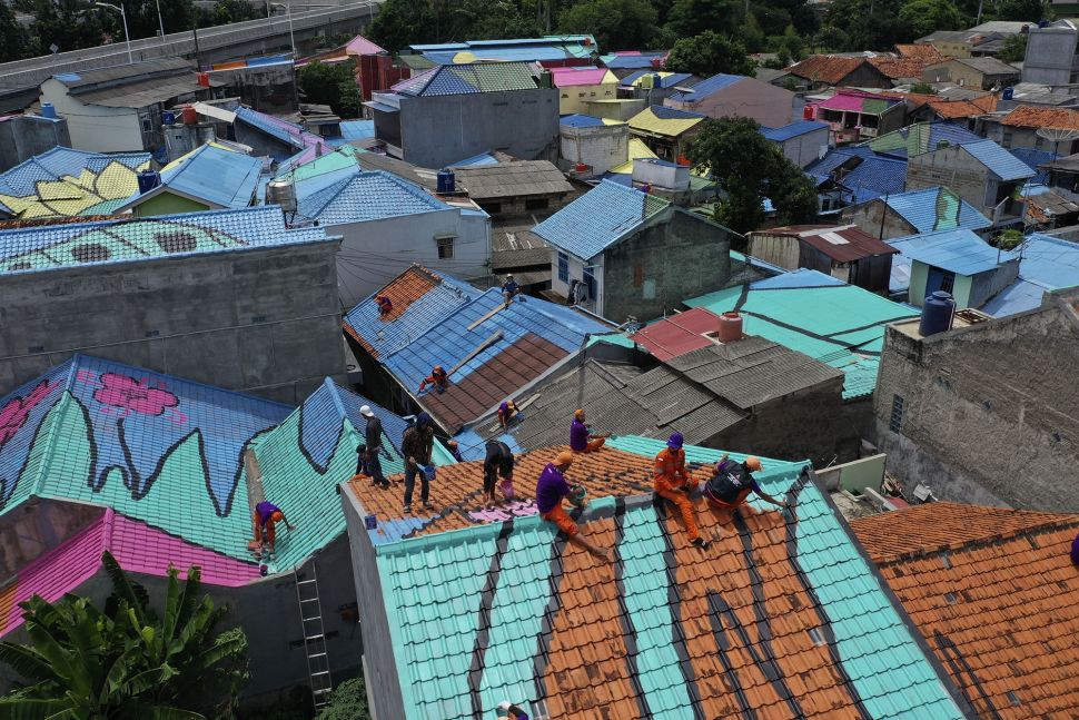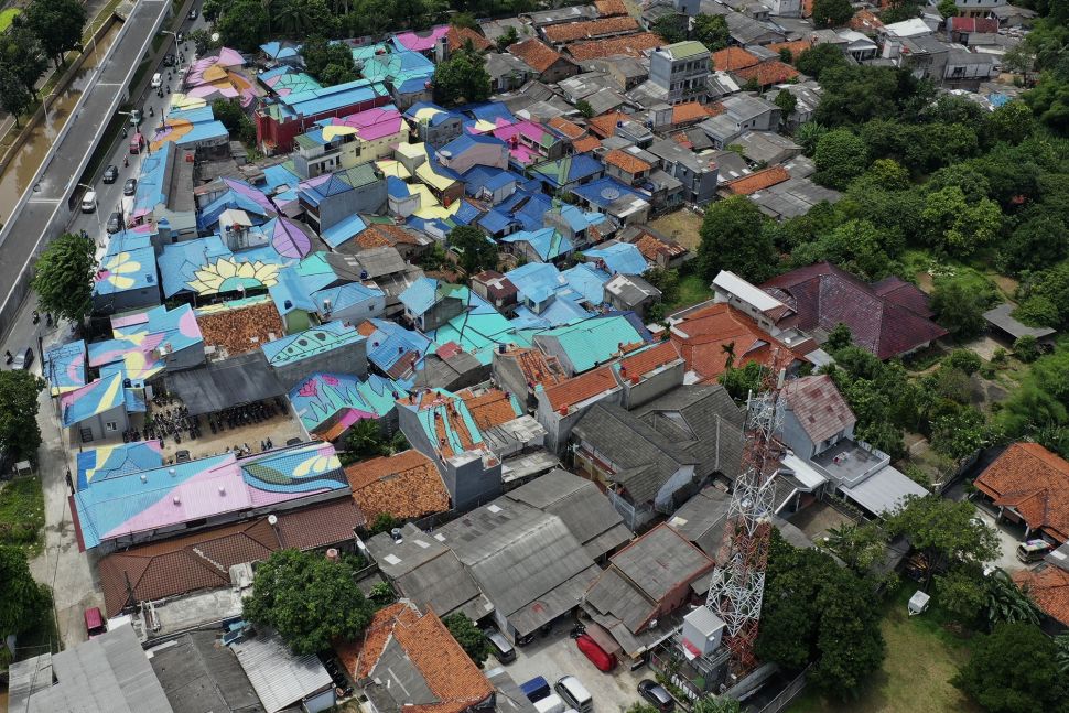 | Foto udara atap hunian warga yang dicat di RT 012, RW 001 Kelurahan Lenteng Agung, Jagakarsa, Jakarta, Rabu (16/12/2020). [Suara.com/Angga Budhiyanto] |