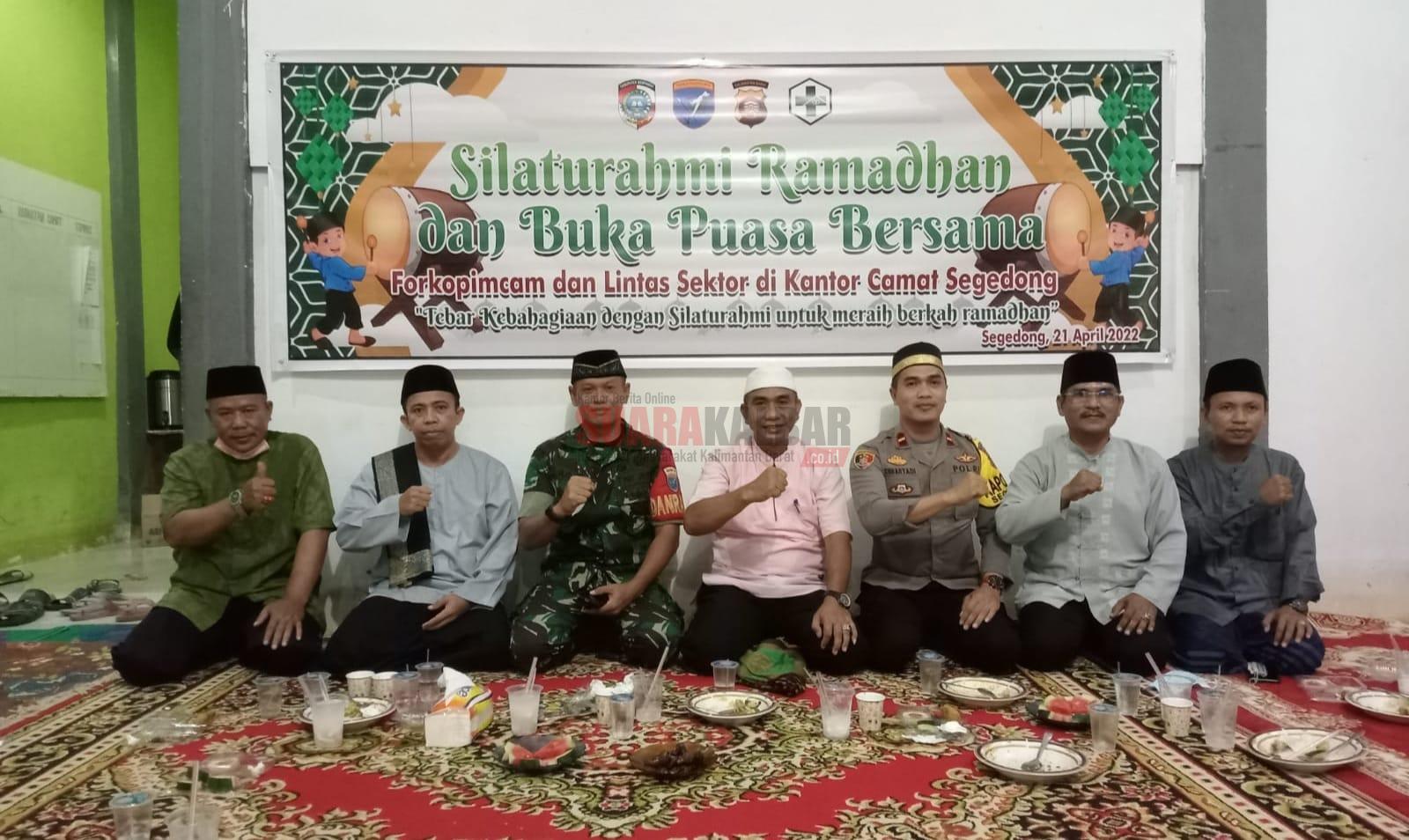 Camat Segedong, Arifin, dan jajaran Forkorpimcam beserta lintas sektor berfoto bersama usai melaksanakan silaturahmi ramadan dan buka puasa bersama di Kantor Camat Segedong, Kamis (21/4/2022). SUARAKALBAR.CO.ID/Foto. IST