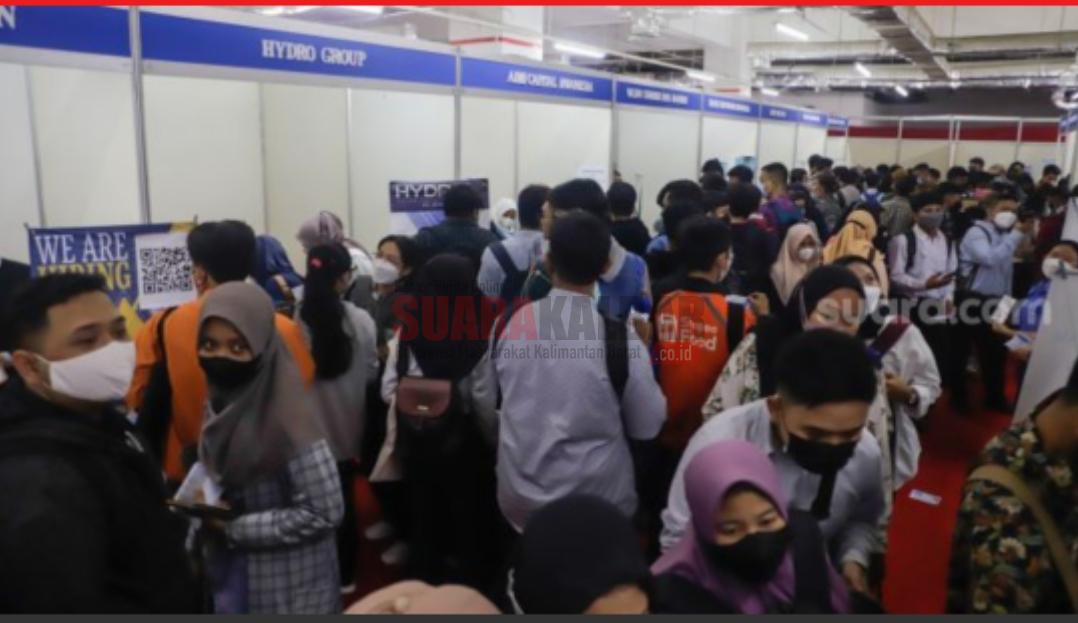 Suara Kalbar – Sejumlah pencari kerja (kanan) mencari informasi pekerjaan pada acara “Jakarta Job Fair” di Thamrin City, Jakarta Pusat, Senin (8/8/2022). Dinas Tenaga Kerja, Transmigrasi, dan Energi Provinsi DKI Jakarta menggelar pameran bursa kerja tersebut di lima wilayah kota administrasi Jakarta mulai 27 Juli hingga 11 Agustus 2022. Pameran bursa kerja ini diikuti lebih dari 200 perusahaan dan terdapat 20 ribu lowongan pekerjaan.