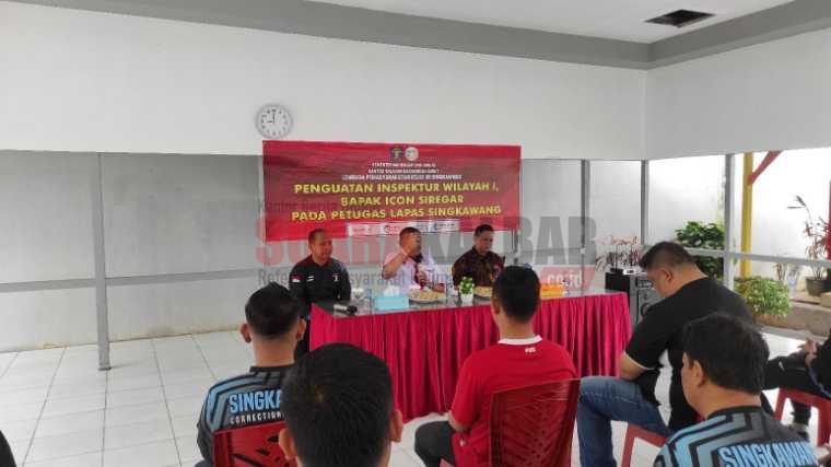 Singkawang (Suara Kalbar)- Inspektur Wilayah I Kemenkumham RI, Icon Siregar berkunjung ke Lapas Kelas II B Singkawang dalam rangka memberikan penguatan kepada seluruh petugas dan warga binaan Lapas Kelas II B Singkawang, Jumat (3/2/2023).