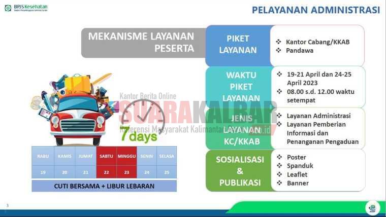 Jakarta (Suara Kalbar) – Peserta Jaminan Kesehatan Nasional (JKN) tetap bisa mengakses pelayanan khususnya yang berkaitan dengan kebutuhan administrasi kepesertaan JKN di masa libur lebaran. Direktur Utama BPJS Kesehatan, Ghufron Mukti mengatakan akses pelayanan sangat terbuka bagi peserta di saat masa libur lebaran tahun 2023. Menurutnya, pihaknya berkomitmen memberikan pelayanan yang terbaik bagi seluruh peserta.