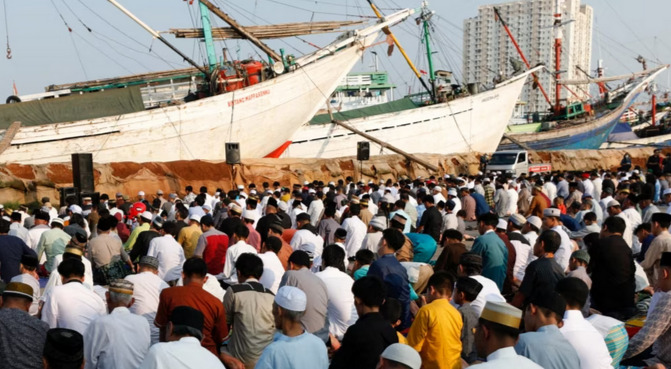 Di Tanah Air, negara berpenduduk mayoritas Muslim terbesar di dunia, ratusan jemaah melakukan salat Idulfitri di Pelabuhan Sunda Kelapa di Jakarta Utara.
