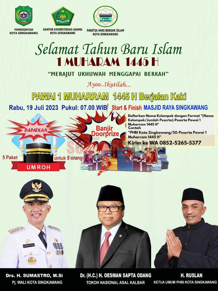 Pawai 1 Muharram 1445 H di Kota Singkawang digelar Panitia Hari Besar Islam (PHBI) pada 19 Juli 2023 dengan titik start dan finish di depan Masjid Raya Singkawang.