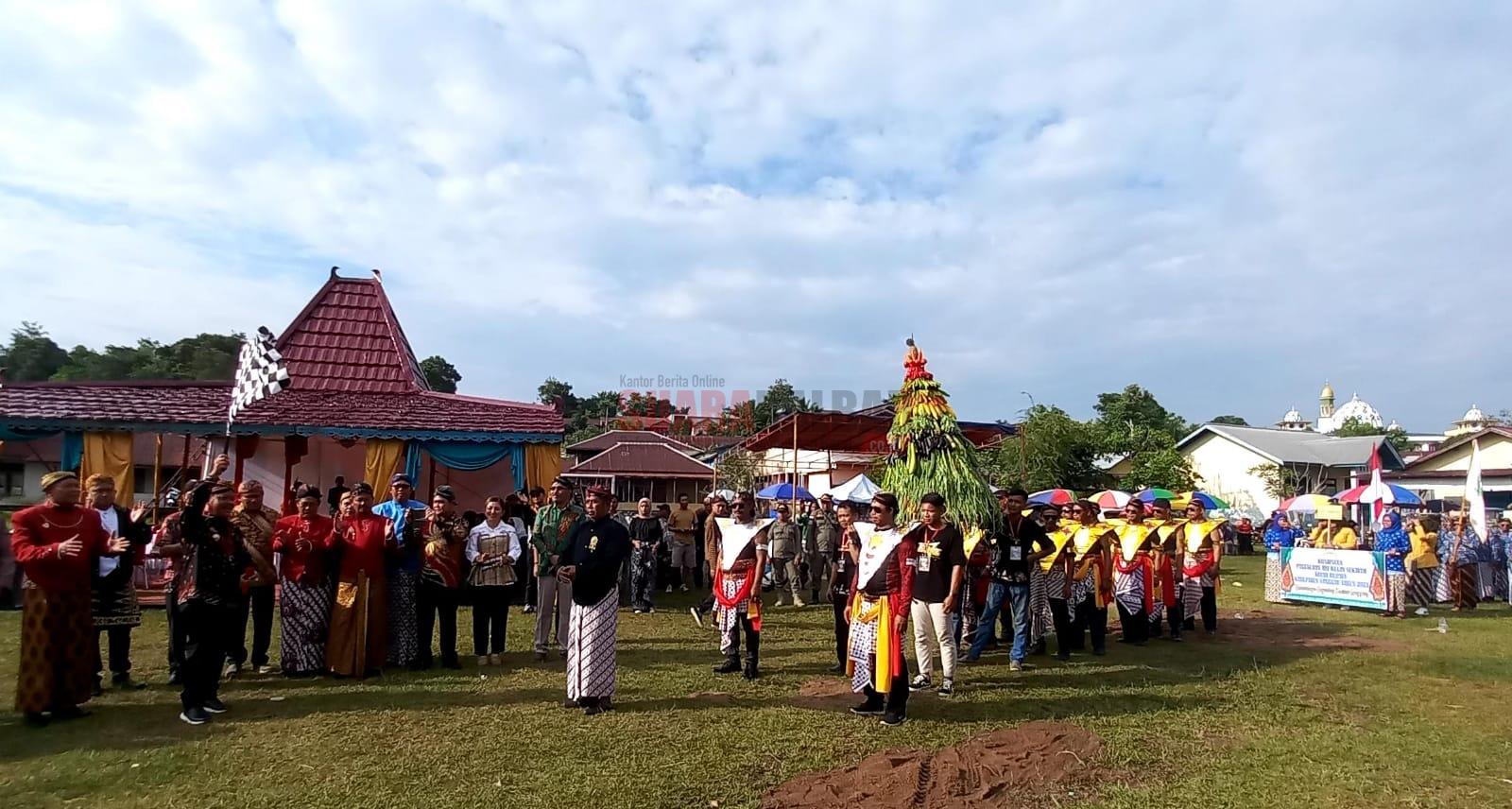 Sanggau (Suara Kalbar) -Bupati Sanggau Paolus Hadi melepas peserta Festival Kirab Budaya dan Campur Sari yang digelar Paguyuban Jawa Guyub, Gawe, Guno (G3) Kabupaten Sanggau di Lapangan Rawa Bhakti sanggau, Minggu (15/10/2023).