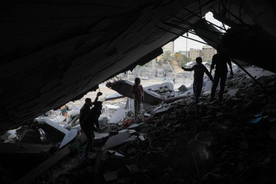 Orang-orang memeriksa reruntuhan bangunan pascaserangan udara Israel di Kota Khan Younis di Jalur Gaza selatan pada 23 Desember 2023. (Xinhua/Rizek Abdeljawad).