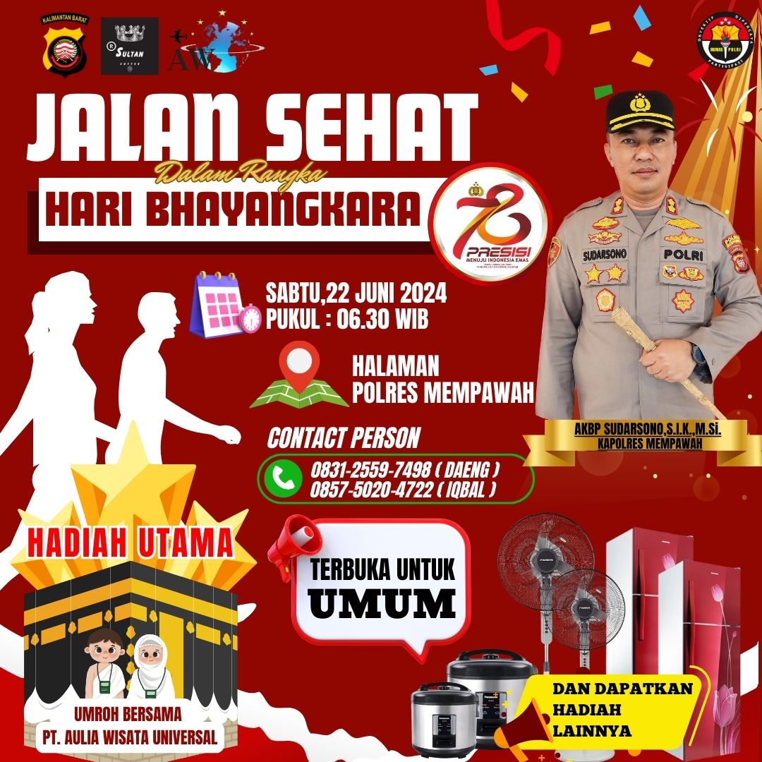 Mempawah (Suara Kalbar) – Untuk memeriahkan Hari Bhayangkara ke-78, Polres Mempawah Polda Kalbar akan menggelar Jalan Sehat, Sabtu (22/6/2024) pukul 06.300 WIB.