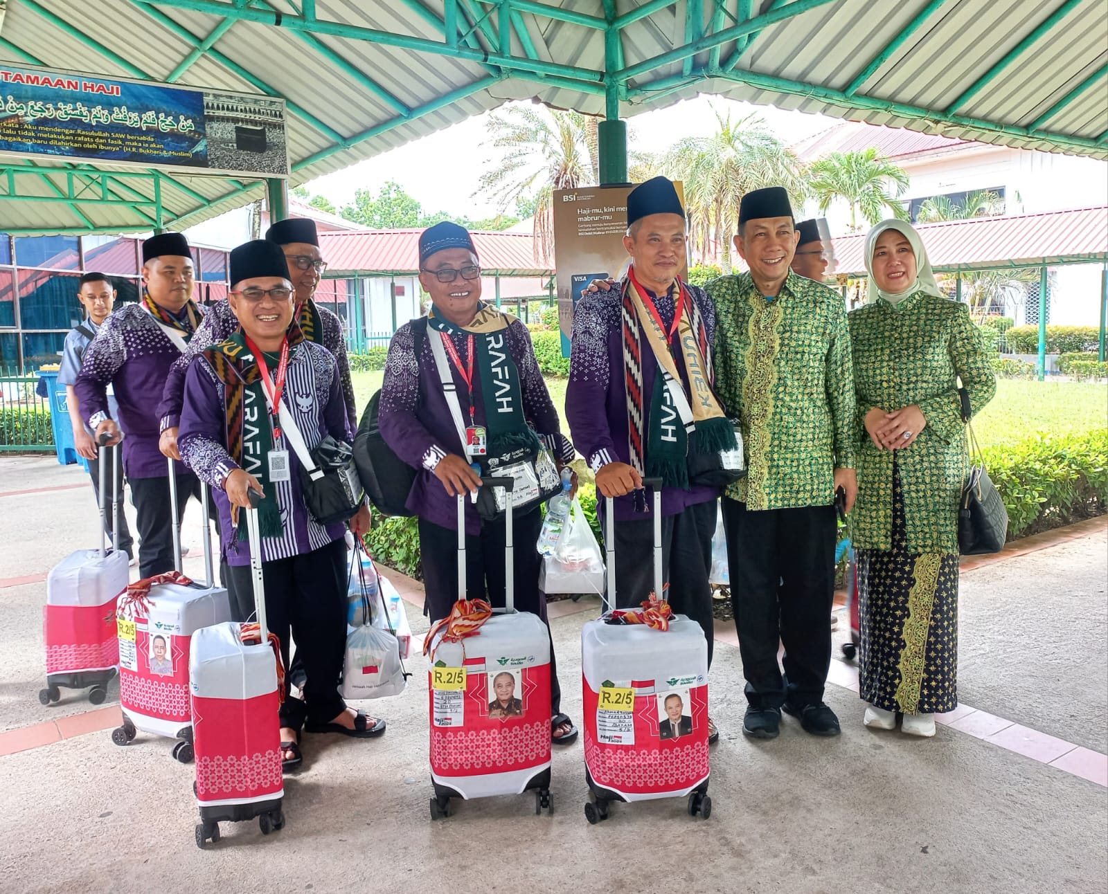Pontianak (Suara Kalbar) – Pj Sekretaris Daerah (Sekda) Kota Pontianak Zulkarnain beserta istri didampingi Kepala Kantor Kementerian Agama (Kemenag) Kota Pontianak Mi’rad, menyambut kedatangan JCH asal Kota Pontianak di Aula Arafah 1, Asrama Haji Batam, Sabtu (1/6/2024).