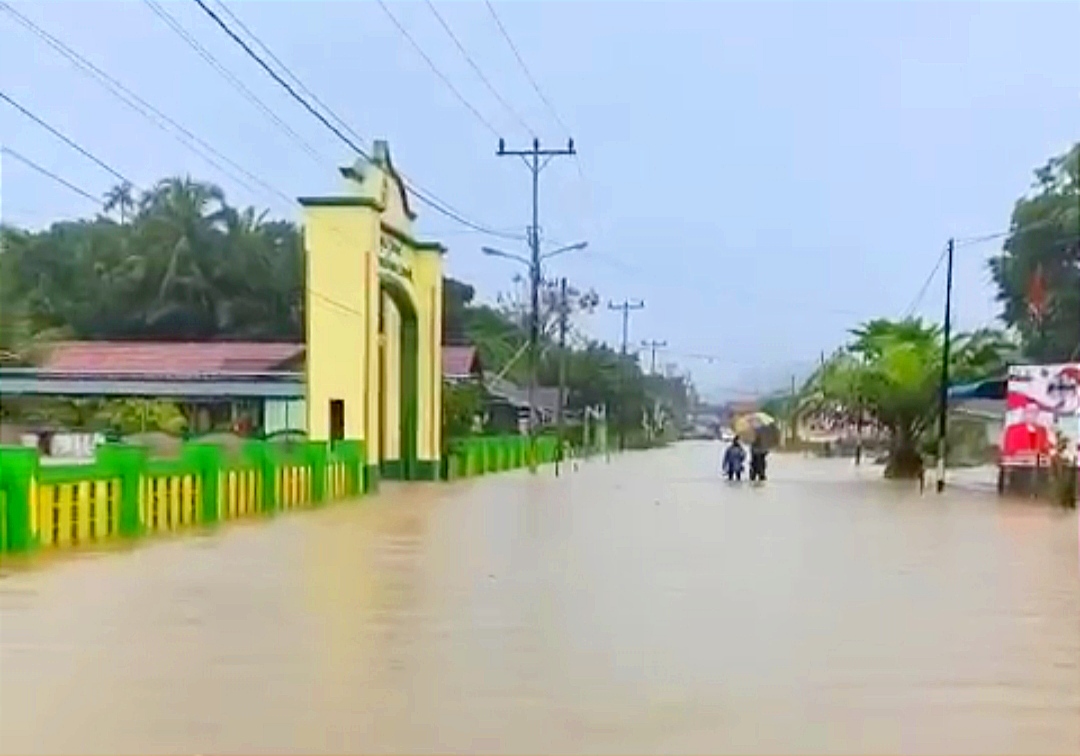 Akibat tingginya air, petugas pendistribusian logistik Pilkada terpaksa menggunakan perahu di tengah pemukiman penduduk pada Senin (25/11/2024) malam.