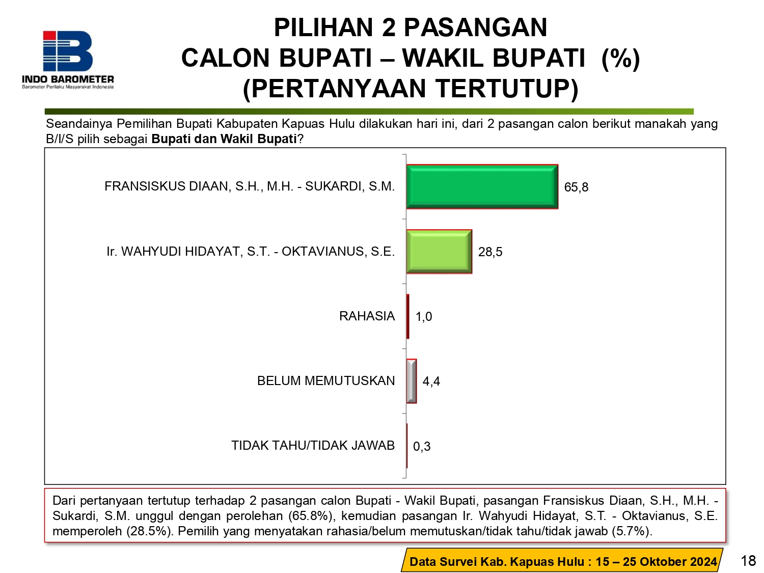 “Dalam simulasi dua nama, karena pilkada kapuas hulu ada dua nama calon itu temuan kami bahwa calon bupati fransiskus dian elektabilitas nya 65,5% sedangkan Wahyu Hidayat elektabilitas nya 28,5% kemudian mereka yang belum menjawab, belum memutusukan dan tidak tau atau rahasia ini jumlahnya sekitar 6 persen, jadi sebagian besar pemilih di kapuas hulu sudah punya pilihan,”ucapnya.