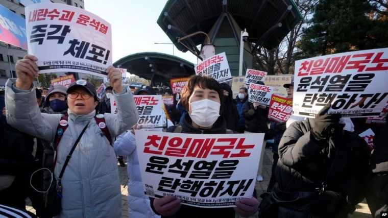 Anggota oposisi utama Partai Demokrat menggelar unjuk rasa menentang Presiden Korea Selatan Yoon Suk Yeol di depan Majelis Nasional di Seoul, Korea Selatan, Rabu, 4 Desember 2024. Spanduk bertuliskan “Mari kita makzulkan Yoon Suk Yeol.” (Ahn Young-joon/AP). SUARA KALBAR.CO.ID/HO.VoA Indonesia.