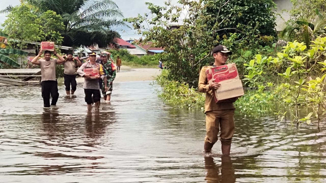 Personel Polsek Bika ketika penyaluran bansos bagi warga terdampak banjir, Jumat (20/12/2024). SUARAKALBAR.CO.ID/Istimewa