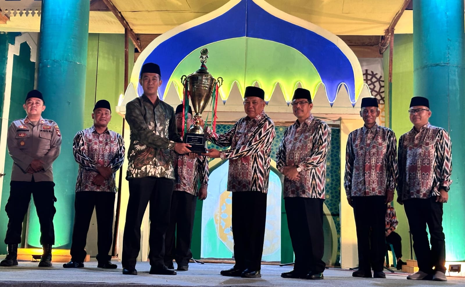 Wakil Bupati Mempawah Juli Suryadi Burdadi menyerahkan piala bergilir kepada Camat Anjongan Feri Ramadhani yang menjadi juara umum MTQ ke-36, Jumat (30/5/2025). SUARAKALBAR.CO.ID/Diskominfo Mpw