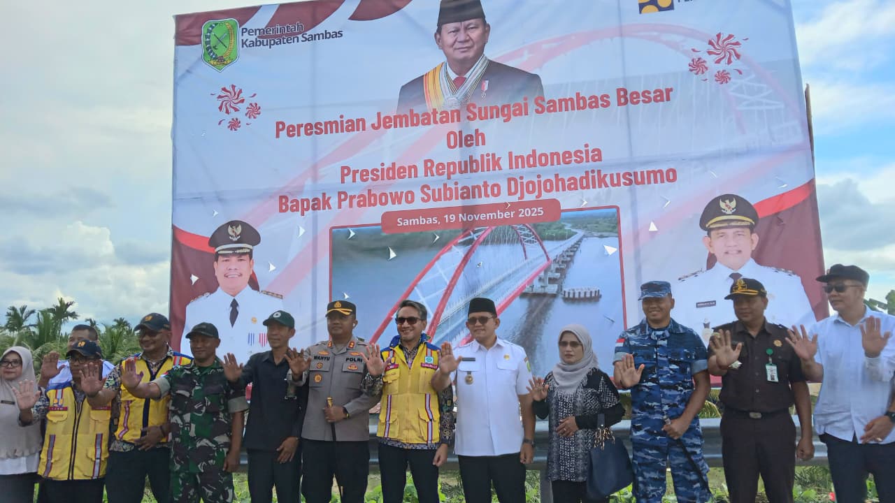 Sambas (Suara Kalbar) – Presiden Republik Indonesia, Prabowo Subianto, meresmikan Jembatan Sungai Sambas Besar (JSSB) melalui sambungan virtual Zoom pada Rabu (19/11/2025). Jembatan yang kini menjadi jembatan terpanjang di Kalimantan Barat itu turut diresmikan bersamaan dengan dua jembatan lain, dua underpass, dan satu flyover di berbagai daerah.
