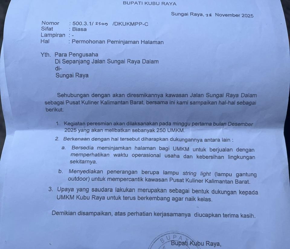 Pemkab Kubu Raya Edarkan Surat Peminjaman tempat Usaha Bagi UMKM, Begini Isi Aturannya