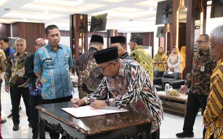 Wabup Mempawah Juli Suryadi Burdadi menandatangani Komitmen Bersama Pengembangan Kompetensi bagi JPT Pratama di Aula Garuda Terpadu Kantor Gubernur Kalbar, Kamis (22/1/2026). [SUARAKALBAR.CO.ID/Prokopim Mpw]