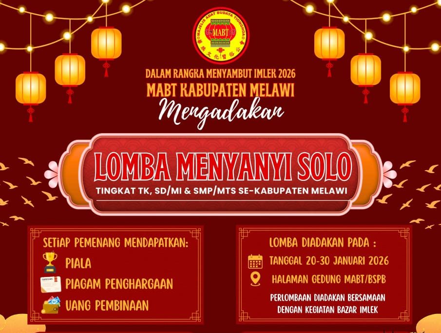 Melawi (Suara Kalbar)- Dalam rangka menyambut Tahun Baru Imlek 2026, Majelis Adat Budaya Tionghoa (MABT) Kabupaten Melawi menggelar Lomba Menyanyi Solo tingkat TK, SD/MI dan SMP/MTs se-Kabupaten Melawi. Kegiatan ini menjadi salah satu rangkaian utama dalam semarak perayaan Imlek yang akan dipusatkan di halaman Gedung MABT/BSPBK Melawi.
