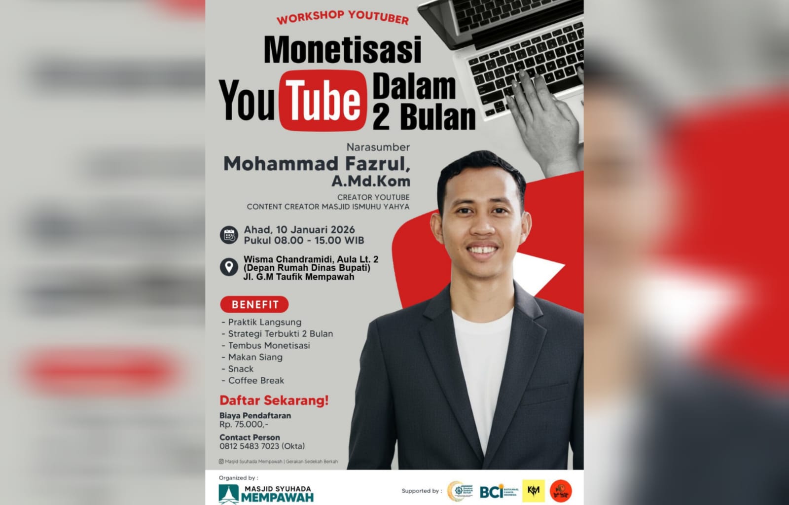 Workshop YouTuber bertajuk “Monetisasi YouTube dalam 2 Bulan” dijadwalkan berlangsung pada Minggu 11 Januari 2026, dan saat ini pendaftaran peserta tersisa dua hari lagi.
