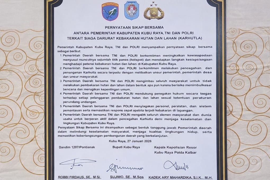Pernyataan Sikap Bersama tersebut ditandatangani oleh Komandan Kodim 1207/Kubu Raya Kolonel Inf Robbi Firdaus, S.E., M.Si., Bupati Kubu Raya Sujiwo, S.E., M.Sos., serta Kapolres Kubu Raya AKBP Kadek Ary Mahardika, S.I.K., M.H., dan ditetapkan di Kubu Raya pada Selasa (27/01/2026).