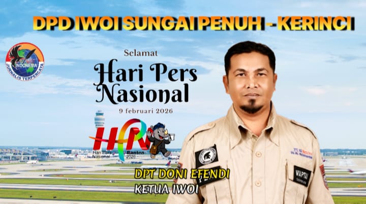 “Atas nama keluarga besar DPD IWOI Sungai Penuh/Kerinci, kami mengucapkan selamat Hari Pers Nasional 9 Februari 2026. Semoga pers Indonesia semakin maju, berintegritas, dan dipercaya masyarakat,” pungkasnya.
