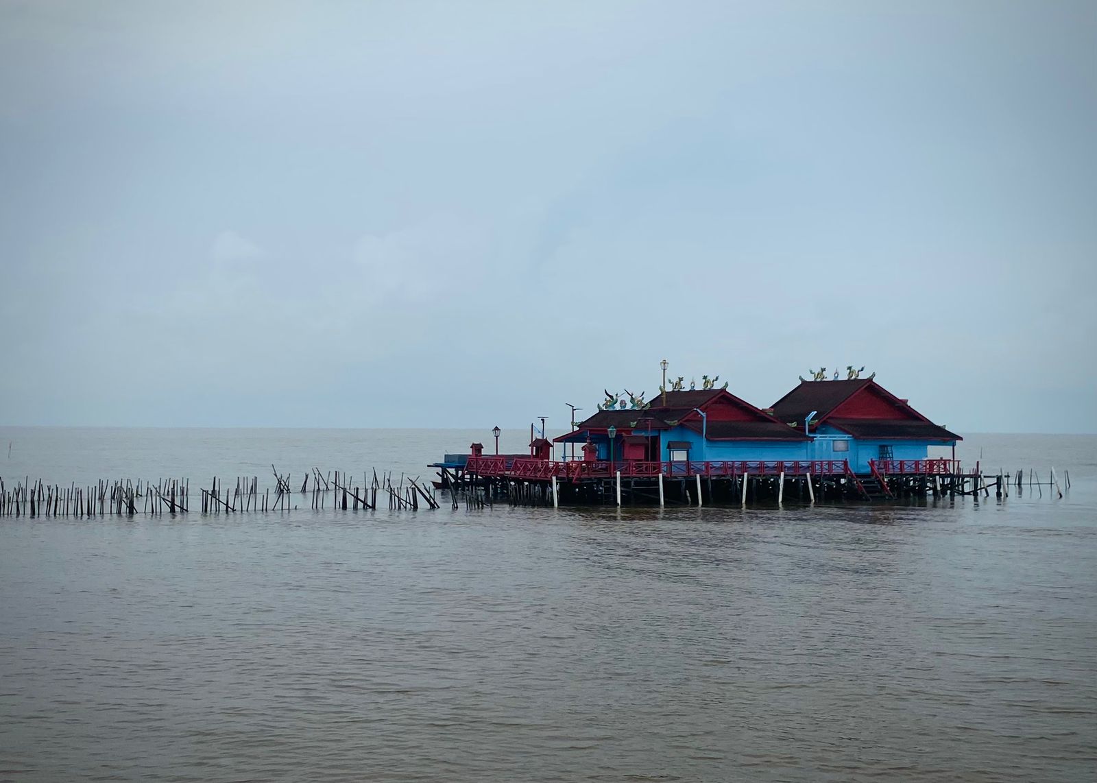 Seperti namanya, kelenteng ini berada di tengah laut, perlu waktu sekitar 30 menit menggunakan perahu klotok atau kapal untuk mencapai tempat ini.